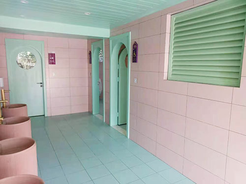 講完了他的核心處理技術(shù),再來看一下里面的內(nèi)室裝飾,哇,是不是圓了你的小公主夢,芭比粉的墻壁,粉色的洗手盆,金色的洗手龍頭,紫色的標識牌,充滿夢幻的拱型門。怎么樣是不是狠狠的滿足了一次兒時的少女心,如果不說它是一座廁所,是不是有一種很想住進來的沖動。